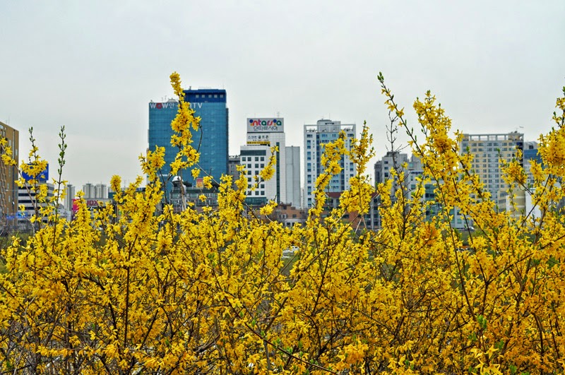 It's finally starting to look and feel like spring in Korea. I am thrilled! My next few posts will probably all be cherry blossoms. No guarantees, but do expect at least one or two. I went with a friend to Yeouido yesterday and those photos will be my next post. I just need to finish editing them. It was cloudy and even rained later in the day, but it was still gorgeous. This one didn't really match with the pinks and whites of the cherry blossoms, but these yellow flowers are also everywhere right now.